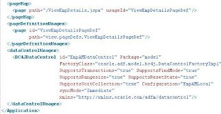 11) DataBindings.cpx:- This file is created for the first time and only once when you drag and drop any view object or method from data control palette to the jspx page. This page contains information about page definition file corresponding to your jspx page, the data controls used by your application. Ya ya, I know you are now thinking of what is data control and data bindings. Thats actually what I am thinking of my next blog post topic :). Check the following figure, it shows the contents of the DataBindings.cpx file, when I drag and dropped the EmpVO from the data control palette to ViewEmpDetails.jspx page as ADF read only table. It shows how ViewEmpDetails.jspx file is linked to its page definition file ViewEmpDetailsPageDef.xml:-